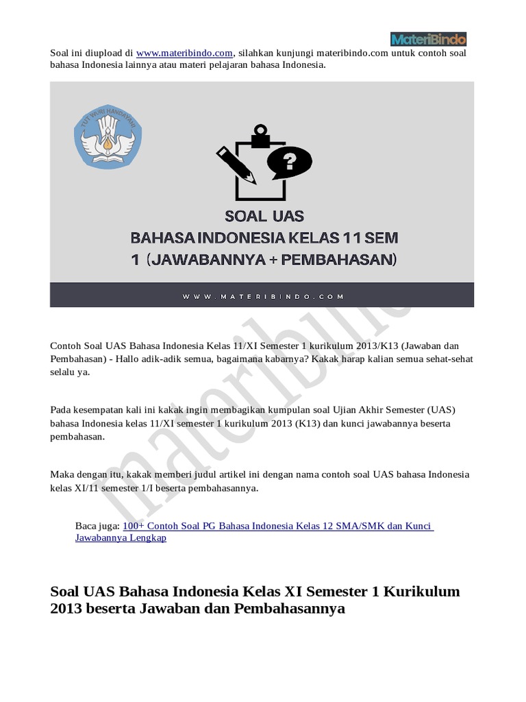 Soal Uas Bahasa Indonesia Kelas 11 Sma Smk Semester 2 Kunci Jawaban Ukk Pas Pilihan Ganda Essay Tribun Pontianak from cdn-2.tstatic.net Berikut akan dibahas soal latihan uas dan pas untuk siswa kelas 8 smp mata pelajaran bahasa indonesia. Jumlah keseluruhan soal uas bahasa indonesia kelas 12 semester 1 kurikulum 2013 adalah 50 butir soal pilihan ganda beserta kunci jawaban. Berikut adalah 50 soal uas bahasa indonesia untuk kelas xii (12) semester 1 terbaru untuk persiapan menghadapi ulangan yang sekarang telah diubah menjadi penilaian akhir semester (pas). Soal ini sudah kakak susun dengan kunci jawabannya. Indonesia bagian pertama) sampai dengan bab yang terakhir ( baca: Kunci jawaban bahasa indonesia kelas 12 sma soal latihan ulangan pas uas semester 1 ganjil 2020. 50 contoh soal pg bahasa indonesia kelas 12 smama dan kunci jawabnya terbaru. 45 butir soal no kompetensi dasar indikator no soal bentuk.