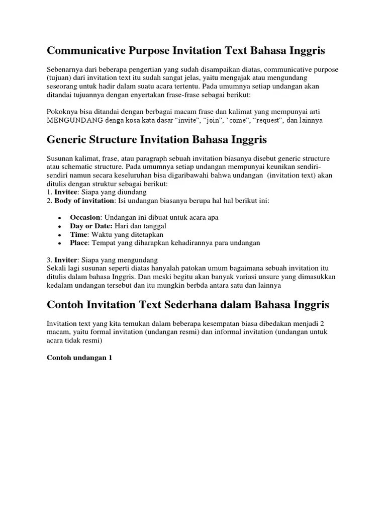 Dengan begini bisa kita simpulkan bahwa tujuan atau fungsi dari sebuah invitation text adalah menginformasikan dan mengajak orang lain untuk . Untuk mengajak atau mengundang seseorang untuk hadir dalam suatu acara tertentu. Setelah mempelajari modul yang berjudul "cordially invited" terutama. Struktur teks, fungsi sosial dan unsur kebahasaan formal invitation(menghargai. Menirukan banyak model teks undangan resmi manpun tidak resmi, serta.